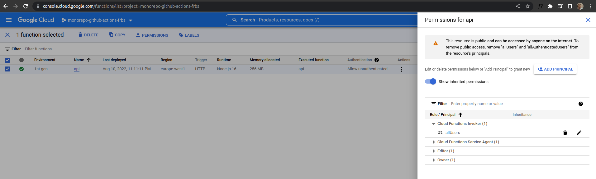 - Select role > Cloud Functions > Cloud Functions Invoker